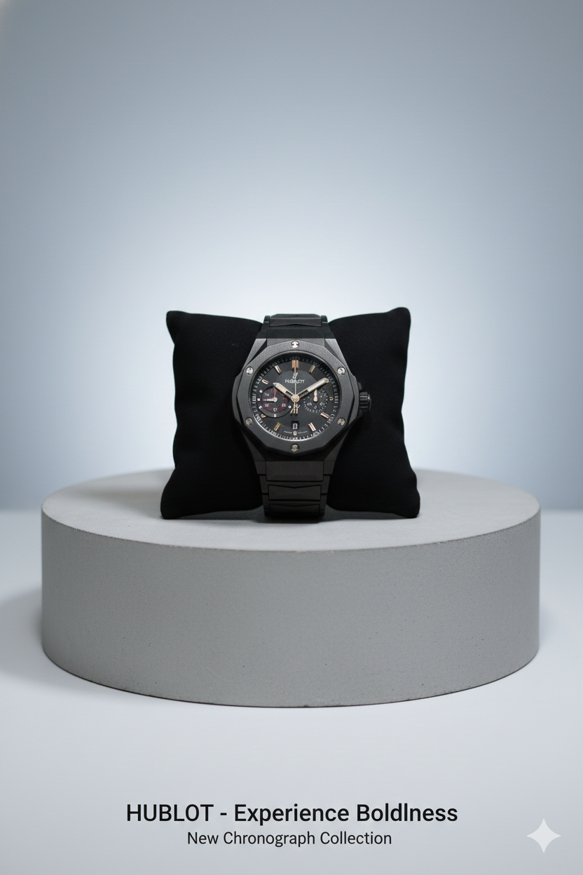 Experience the fusion of precision engineering and modern luxury with the Hublot Black Fusion Chronograph , a timepiece crafted for those who appreciate bold design and uncompromising performance. Its multi-faceted octagonal case, finished in sleek brushed black metal, commands attention from every angle while offering the rugged durability expected of a high-end sports watch.
