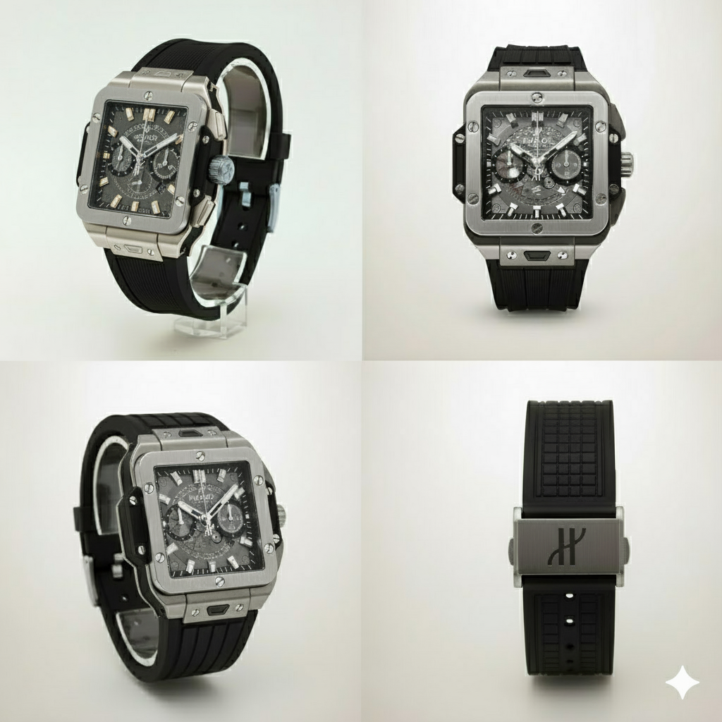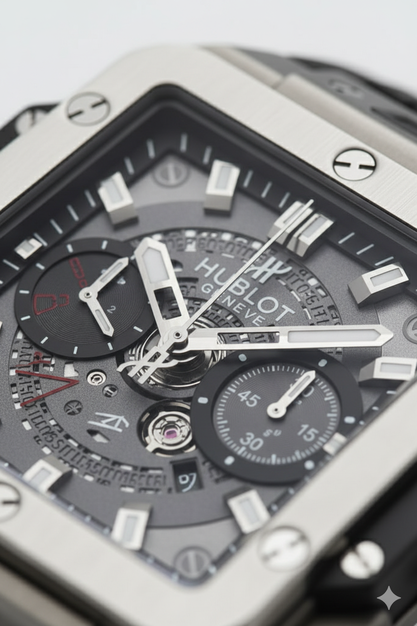 The Hublot Square Bang Unico Titanium 42 mm boldly redefines the architecture of luxury timepieces. By squaring the traditional Big Bang silhouette, Hublot creates a new icon that embodies its Art of Fusion philosophy—uniting daring design, avant-garde mechanics, and exceptional craftsmanship. This watch stands as a declaration of innovation, strength, and individuality.