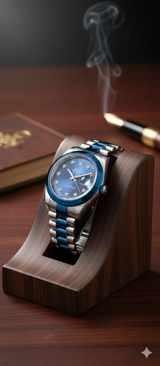 The Rolex Date just Azure Edition is a timeless expression of refined luxury and mechanical excellence. Featuring a striking deep blue dial accented with meticulously set diamond hour markers, this watch commands attention while maintaining understated sophistication. The smooth blue-toned bezel seamlessly frames the dial, enhancing its modern appeal, while the iconic Cyclops lens magnifies the date display for both function and signature Rolex style.