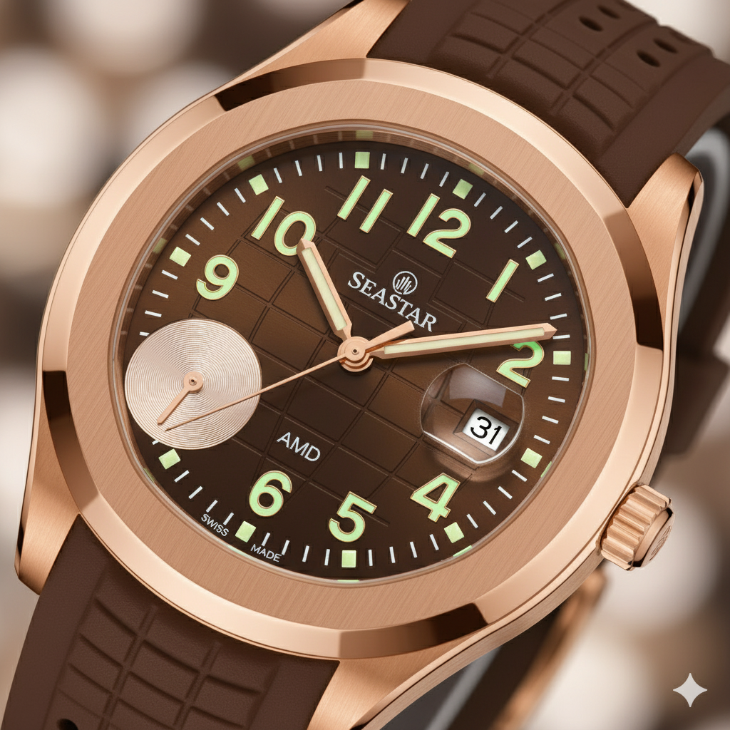Encased in rose gold PVD-coated stainless steel, the Terra Diver exudes a warm, refined glow that commands attention. Its deep chocolate brown dial serves as the visual centerpiece, enriched by a subtle waffle-textured pattern reminiscent of high-end sports watches. This refined grid finish adds both depth and tactile appeal, creating a dynamic interplay with light.