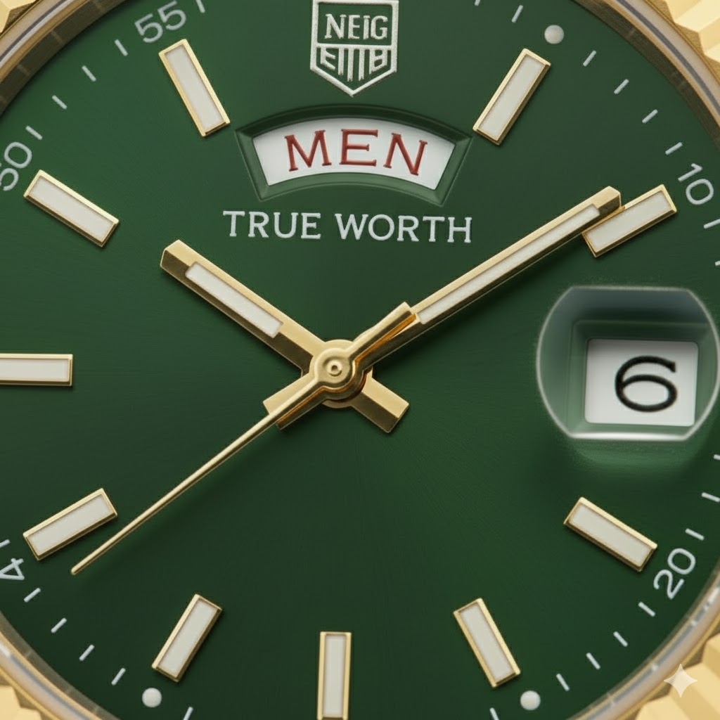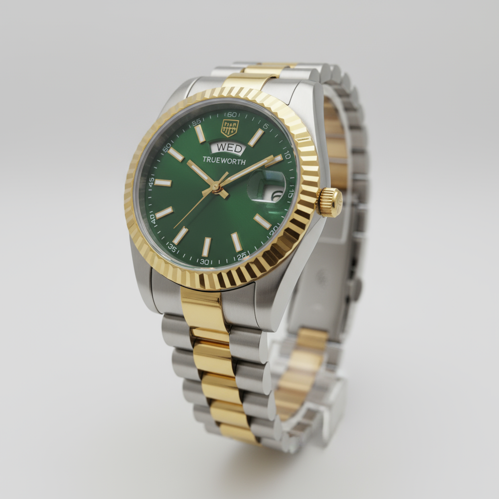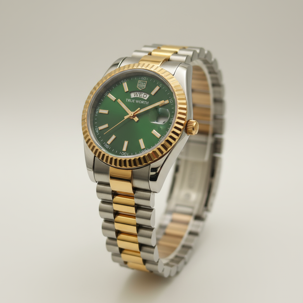 The TRUE WORTH Classic Day-Date is a handsome and accessible timepiece that pays homage to the most iconic and enduring styles in horological history. Designed for the discerning individual, it masterfully blends classic luxury aesthetics with reliable, modern construction. This watch is not merely a tool for telling time; it is a powerful statement piece that delivers a look of prestige and sophisticated elegance, making it suitable for both formal occasions and upscale everyday wear. The combination of its eye-catching green dial and the warmth of gold accents creates a visually rich and distinctive presence on the wrist.